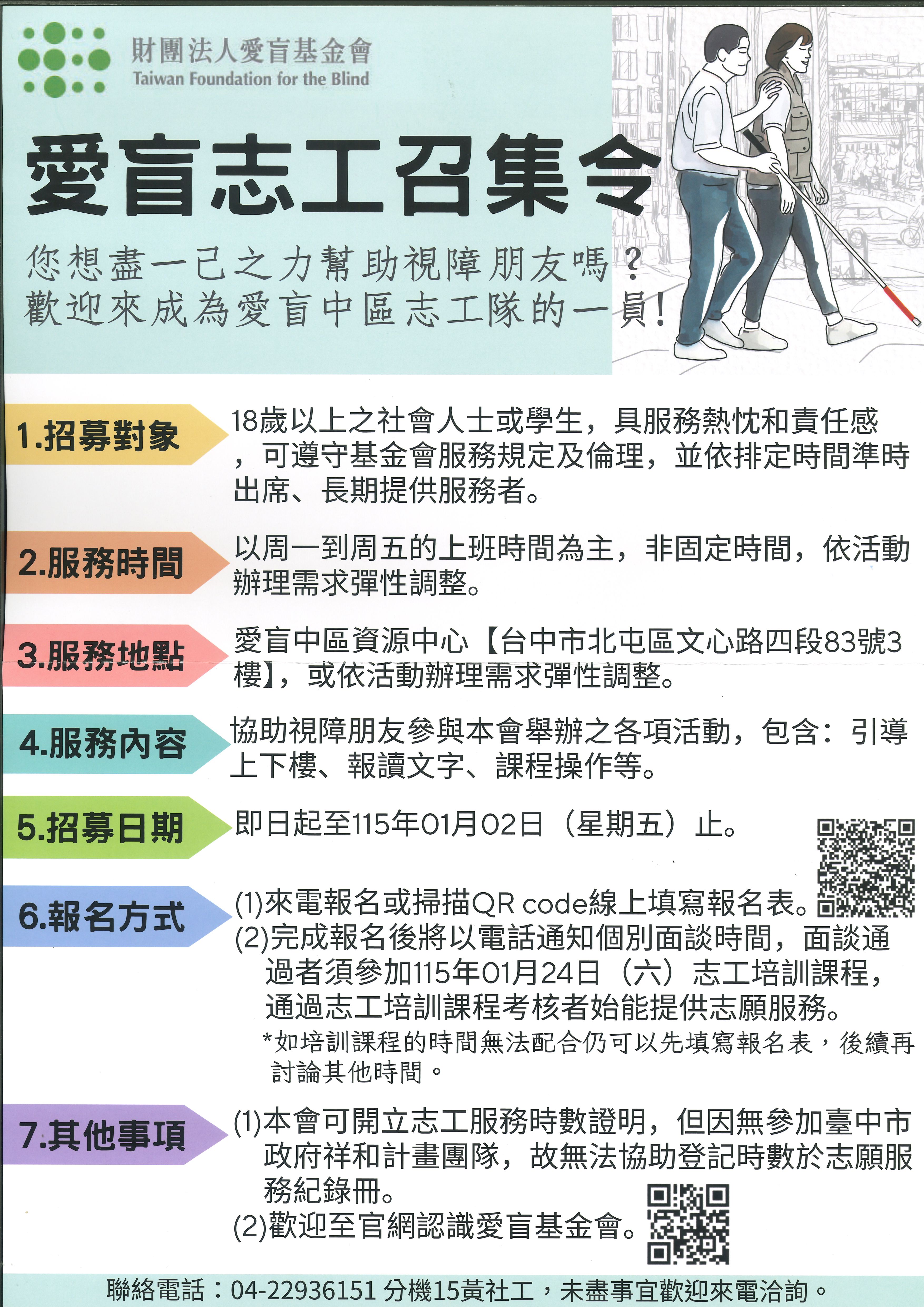 【轉知】財團法人愛盲基金會函送115年度志工招募海報,歡迎報名!!