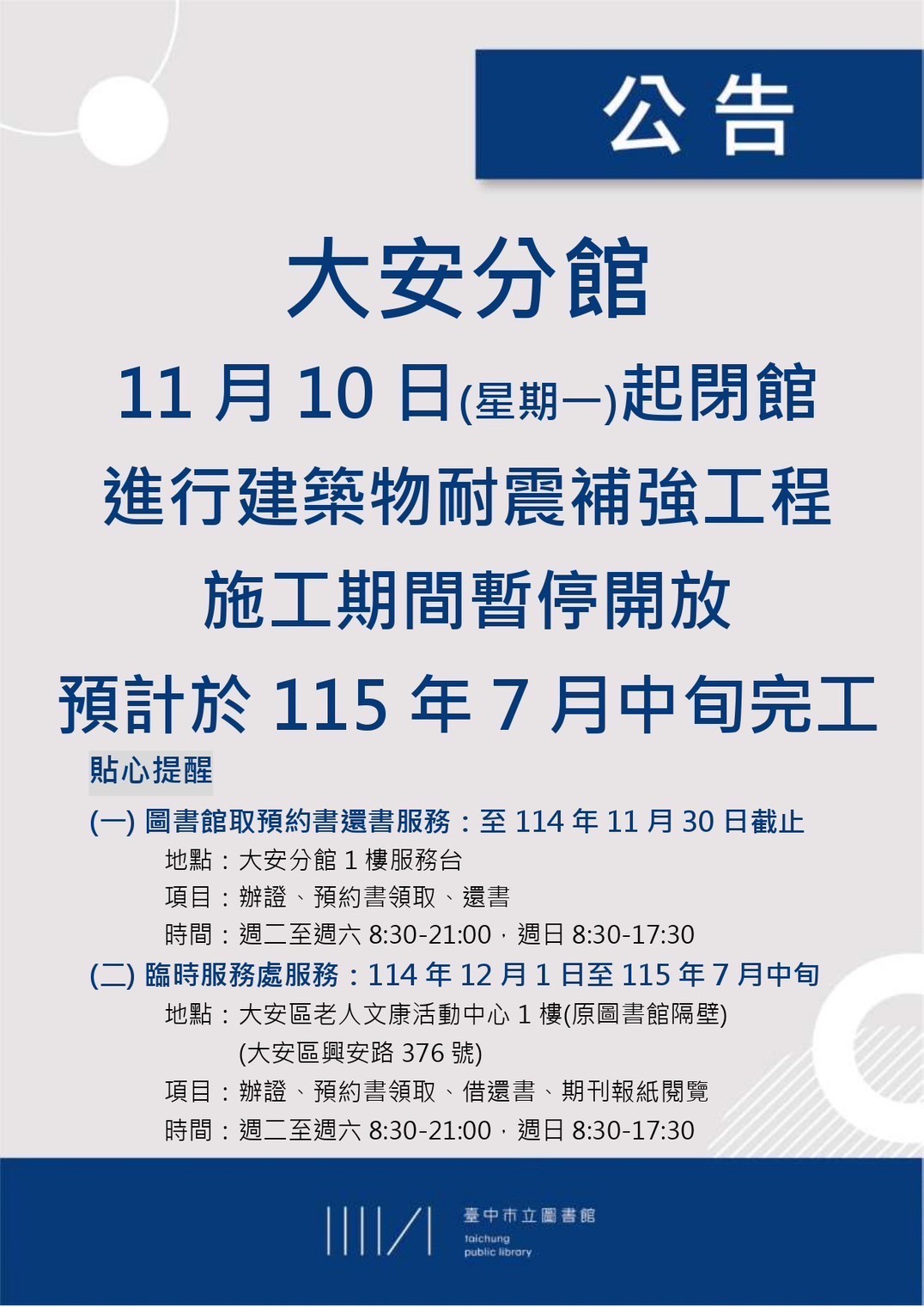 【最新消息】本館大安分館進行耐震補強工程,施工期間將關閉分館排班系統,造成不便,敬請見諒!!